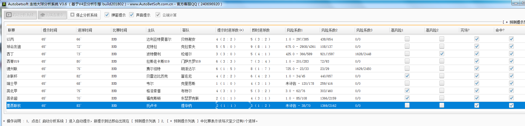 * 界面 上方的 [走地大球预测列表] 中出现的比赛,即是系统自动分析并给出提示的场次。