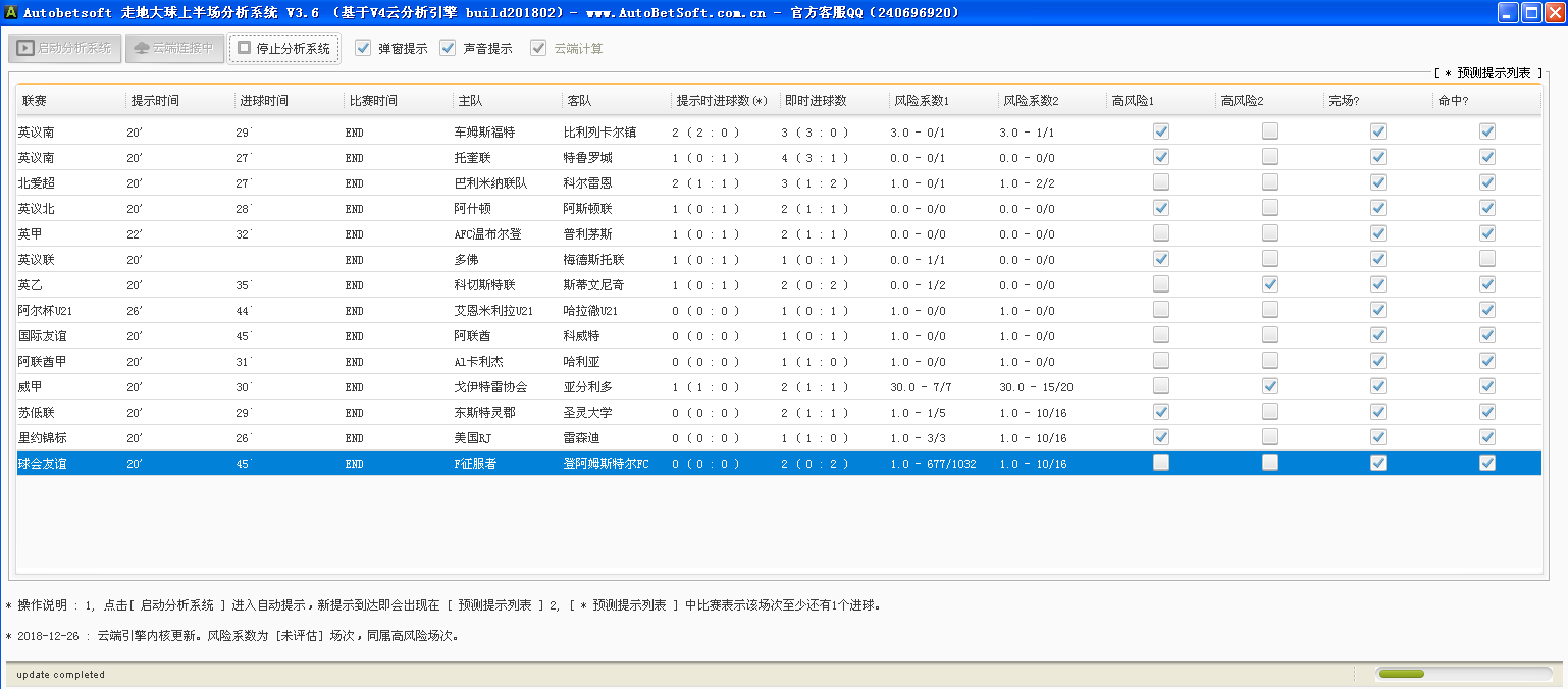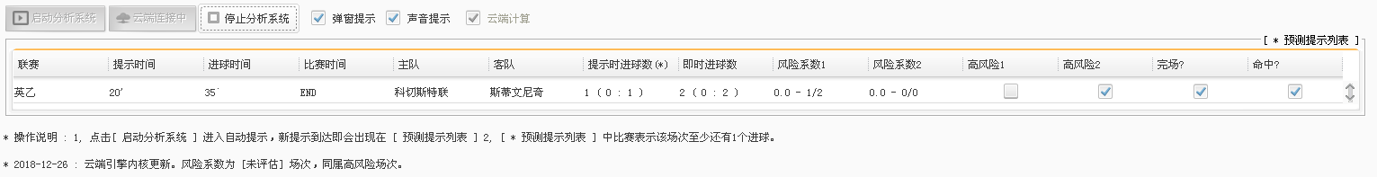 软件使用简单,打开软件按第一个按钮“启动分析系统”后,系统进入全自动分析模式,为避免误操作,系统自动分析时该按钮将不能再按下,实际上,一般情况下,无需再进行任何操作,系统将全自动一直分析。 * 界面上方的 [走地大球预测列表] 中出现的比赛,即是系统自动分析并给出提示的场次。 * [走地大球预测列表] 中第二列 [时间] 即为系统分析并提醒时比赛的时间。 * 第三列为进球时间,第四列为比赛当前时间